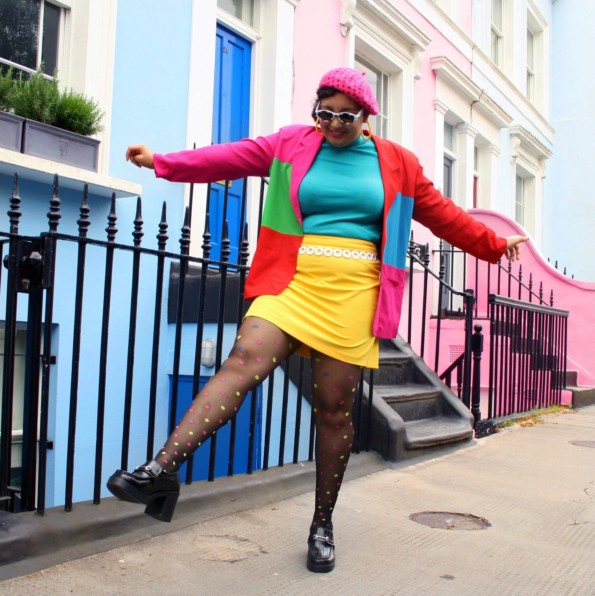 Sprinkle some fun on your outfit with these gorgeous 40 denier black tights with multicolored polka dots knitted right in. Super strong and durable these tights are made to last. Stretchy and comfy, these tights are made to fit every body.