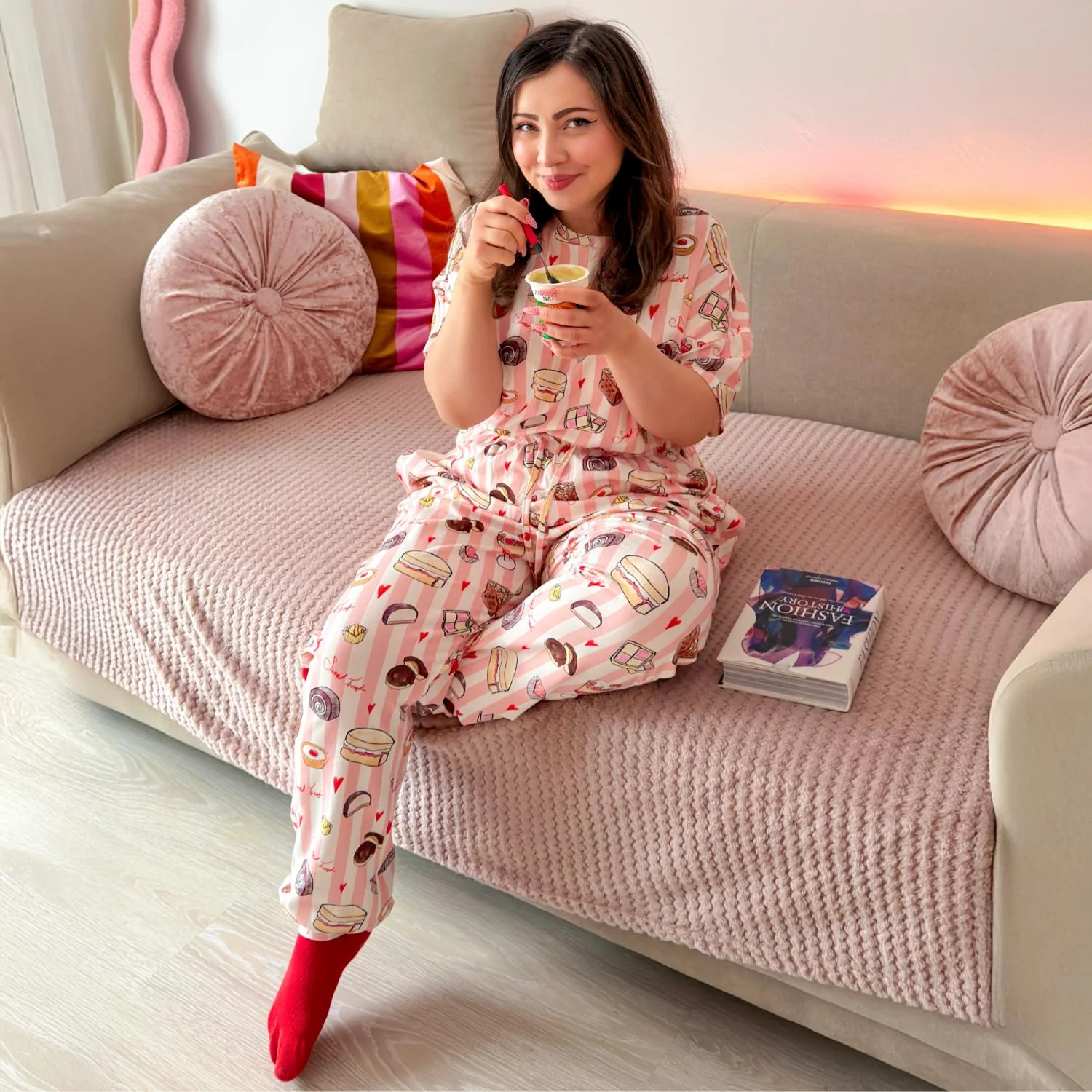 Designed in-house by the brilliant Corina, it’s pure sugar-rush joy in pyjama form. This top is our new boxy short-sleeve tee, cropped to sit just above the belly button so it meets perfectly with the high-waisted bottoms (no chilly gaps here).